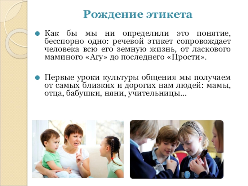 Первые уроки культуры общения мы получаем от самых близких и дорогих нам людей: мамы, отца, бабушки, няни, учительницы...