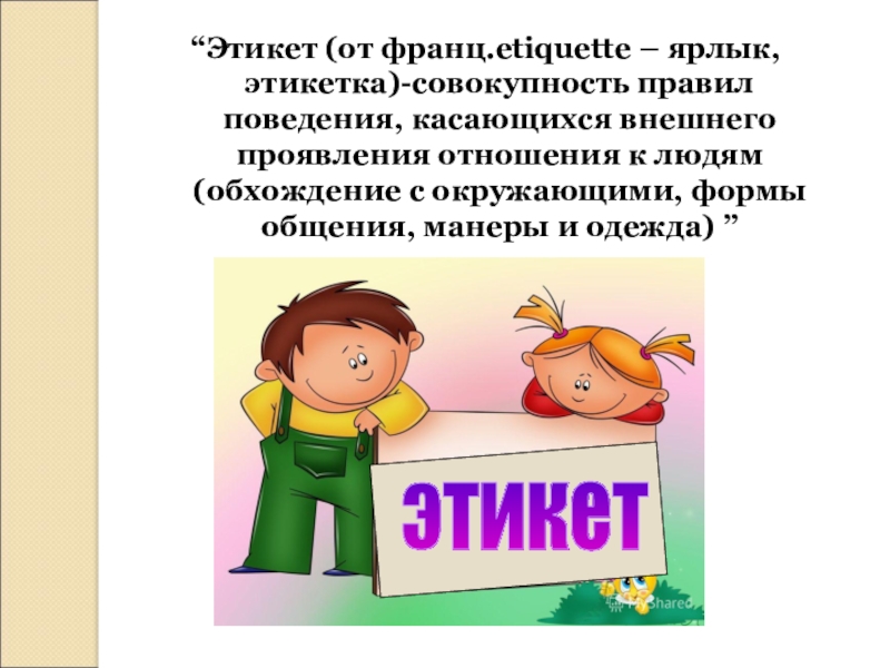 Слайд 2“Этикет (от франц.etiquette – ярлык,этикетка)-совокупность правил поведения, касающихся внешнего проявления