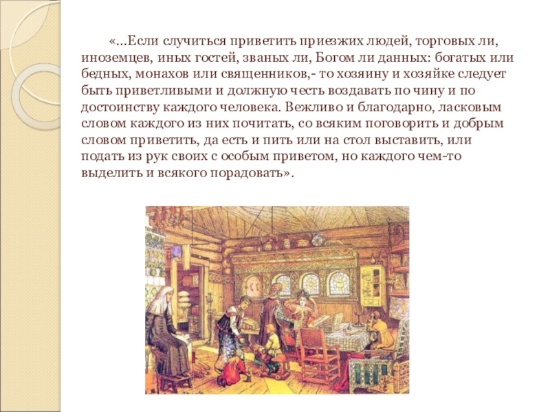 Слайд 14 «...Если случиться приветить приезжих людей, торговых ли, иноземцев, иных гостей,
