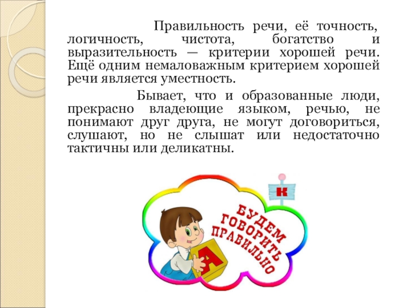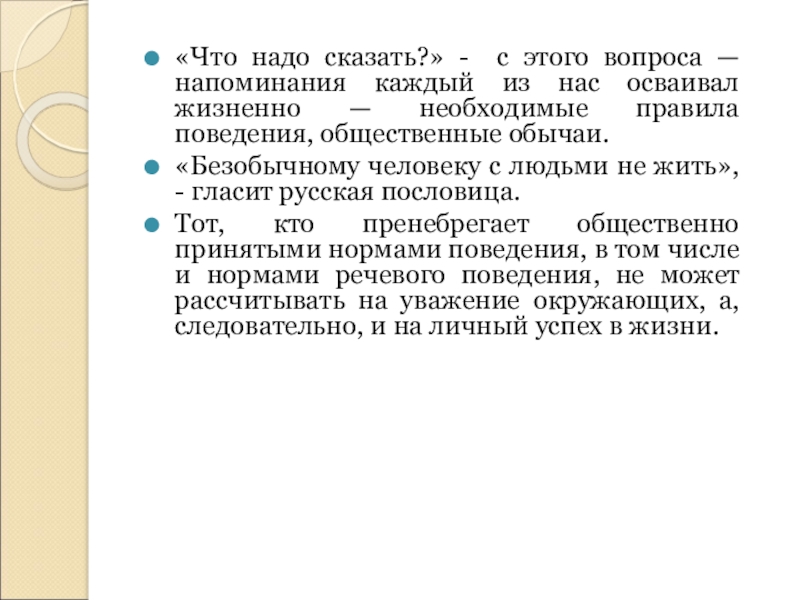 Тот, кто пренебрегает общественно принятыми нормами поведения, в том числе и нормами речевого поведения, не может рассчитывать на уважение окружающих, а, следовательно, и на личный успех в жизни.