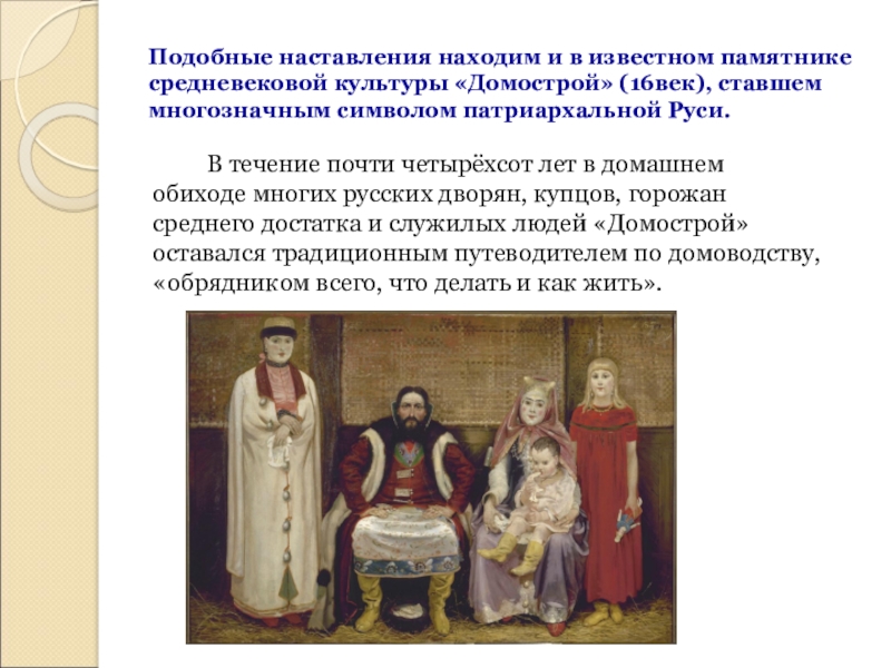 Слайд 12Подобные наставления находим и в известном памятнике средневековой культуры «Домострой»