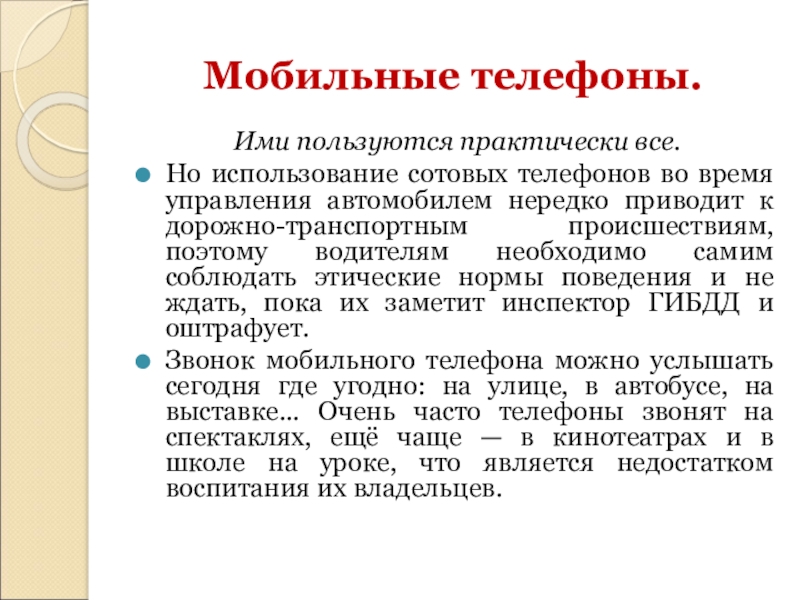 Звонок мобильного телефона можно услышать сегодня где угодно: на улице, в автобусе, на выставке... Очень часто телефоны звонят на спектаклях, ещё чаще — в кинотеатрах и в школе на уроке, что является недостатком воспитания их владельцев.