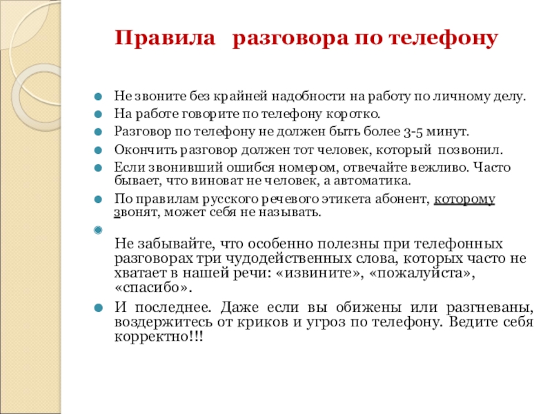 Не забывайте, что особенно полезны при телефонных разговорах три чудодейственных слова, которых часто не хватает в нашей речи: «извините», «пожалуйста», «спасибо».