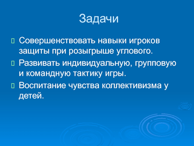 ЗадачиСовершенствовать навыки игроков защиты при розыгрыше углового.Развивать индивидуальную, групповую и командную тактику игры.Воспитание чувства коллективизма у детей.
