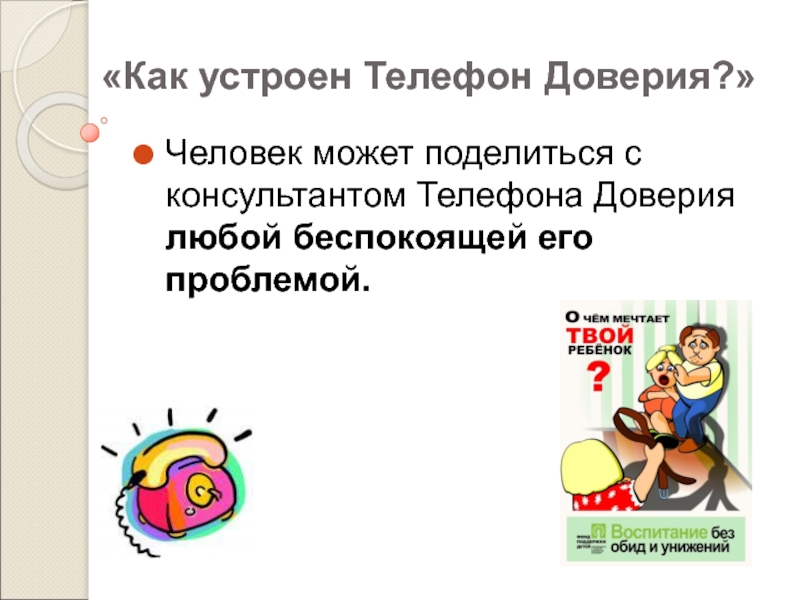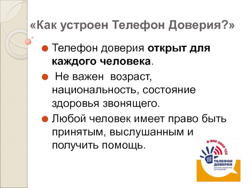 сформулировать мысли и дают понять, что не осуждают и полностью принимают нас такими, какие мы есть. Позвонив на телефон доверия, вы получаете такую возможность