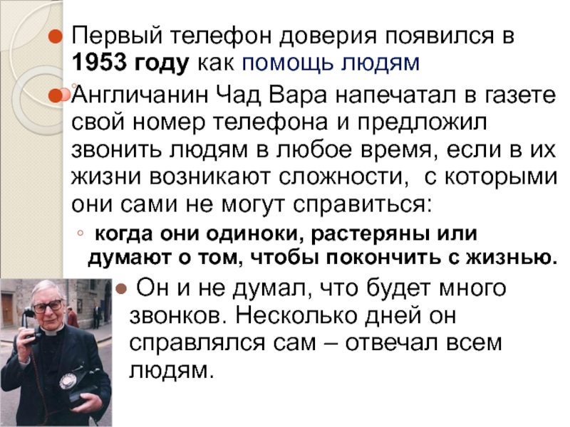 Слайд 2Первый телефон доверия появился в 1953 году как помощь людям
