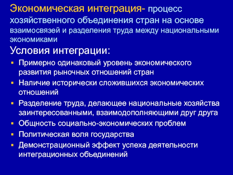 Слайд 8Экономическая интеграция- процесс хозяйственного объединения стран на основе взаимосвязей и