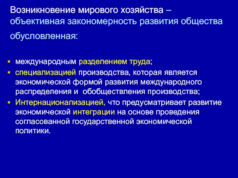 Слайд 4Возникновение мирового хозяйства – объективная закономерность развития общества обусловленная: