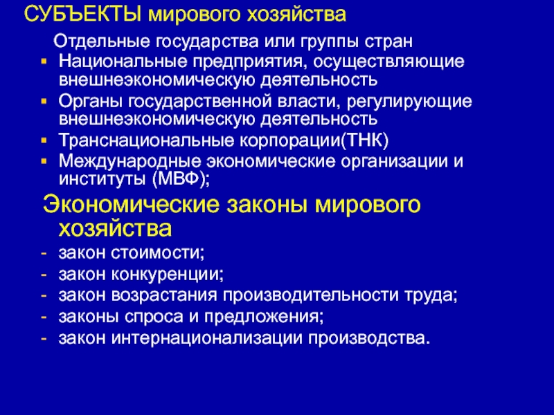 Слайд 6СУБЪЕКТЫ мирового хозяйства