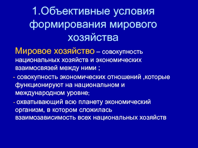 Слайд 31.Объективные условия формирования мирового хозяйства