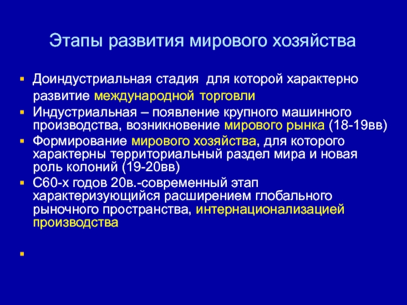 С60-х годов 20в.-современный этап характеризующийся расширением глобального рыночного пространства, интернационализацией производства