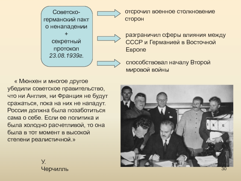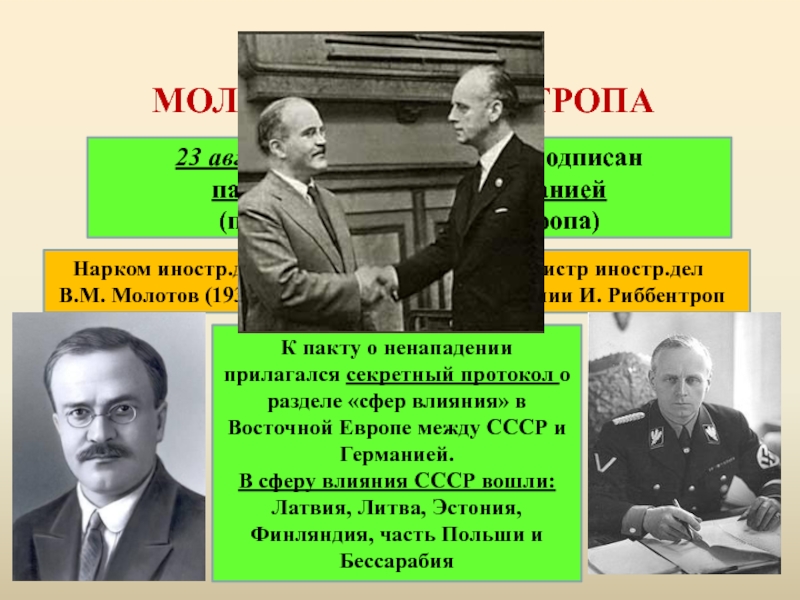 К пакту о ненападении прилагался секретный протокол о разделе «сфер влияния» в Восточной Европе между СССР и Германией.