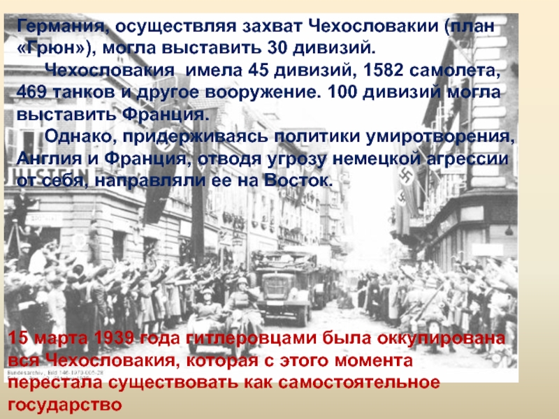 15 марта 1939 года гитлеровцами была оккупирована вся Чехословакия, которая с этого момента перестала существовать как самостоятельное государство