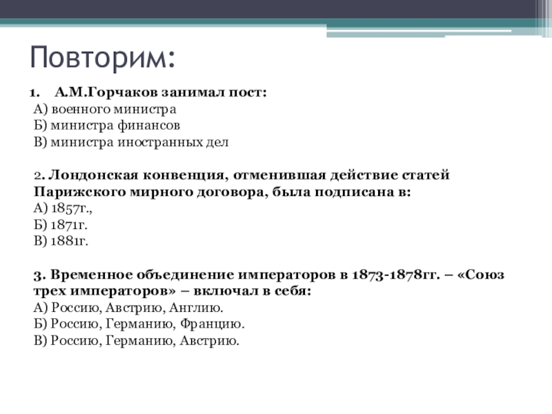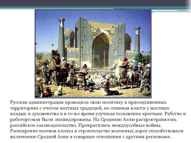 В 1865г. русские войска захватили г.Ташкент и ряд других городов Кокандского ханства. Весной 1866 г. начались успешные военные действия против Бухарского эмирата. В феврале 1873 г. русские войска начали поход на Хивинское ханство. В мае столица ханства Хива была окружена и капитулировала.