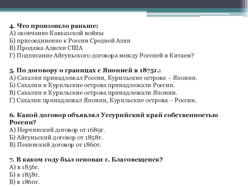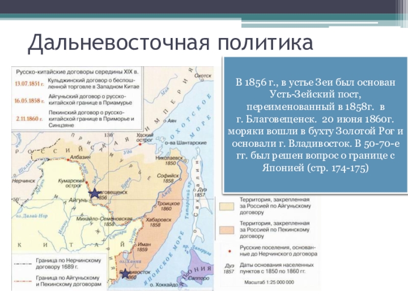 г. Благовещенск. 20 июня 1860г. моряки вошли в бухту Золотой Рог и основали г. Владивосток. В 50-70-е гг. был решен вопрос о границе с Японией (стр. 174-175)