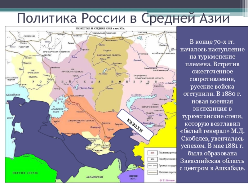 В конце 70-х гг. началось наступление на туркменские племена. Встретив ожесточенное сопротивление, русские войска отступили. В 1880 г. новая военная экспедиция в туркестанские степи, которую возглавил «белый генерал» М.Д.Скобелев, увенчалась успехом. В мае 1881 г. была образована Закаспийская область с центром в Ашхабаде.