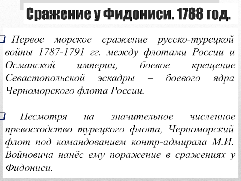 Несмотря на значительное численное превосходство турецкого флота, Черноморский флот под командованием контр-адмирала М.И. Войновича нанёс ему поражение в сражениях у Фидониси.