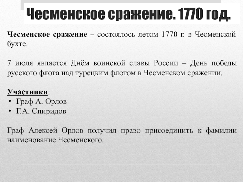 Граф Алексей Орлов получил право присоединить к фамилии наименование Чесменского.