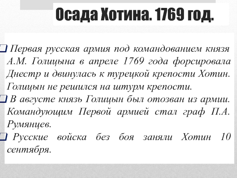 двинулась к турецкой крепости Хотин. Голицын не решился на штурм крепости.