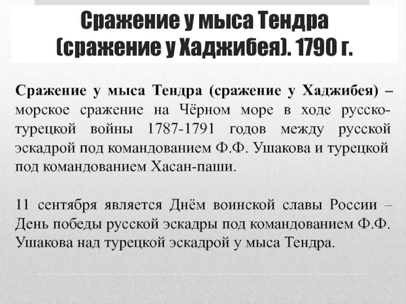 11 сентября является Днём воинской славы России – День победы русской эскадры под командованием Ф.Ф. Ушакова над турецкой эскадрой у мыса Тендра.