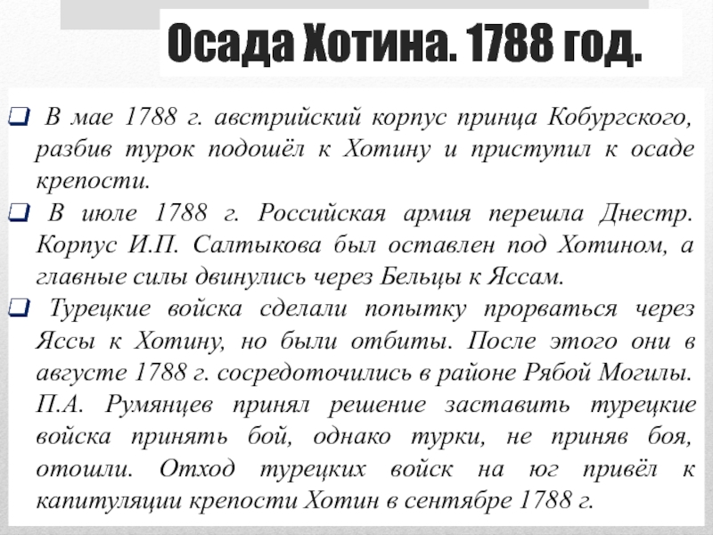 В июле 1788 г. Российская армия перешла Днестр. Корпус И.П. Салтыкова был оставлен под Хотином, а главные силы двинулись через Бельцы к Яссам.
