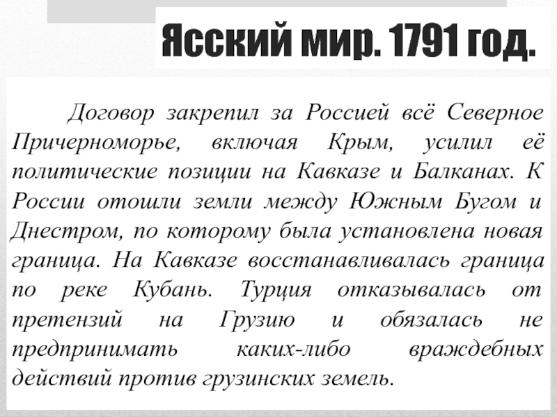 Кавказе и Балканах. К России отошли земли между Южным Бугом и Днестром, по которому была установлена новая граница. На Кавказе восстанавливалась граница по реке Кубань. Турция отказывалась от претензий на Грузию и обязалась не предпринимать каких-либо враждебных действий против грузинских земель.