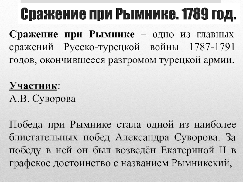 Победа при Рымнике стала одной из наиболее блистательных побед Александра Суворова. За победу в ней он был возведён Екатериной II в графское достоинство с названием Рымникский,