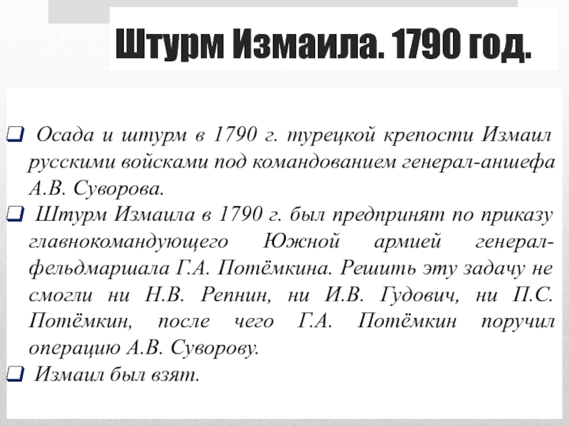 1790 г. был предпринят по приказу главнокомандующего Южной армией генерал-фельдмаршала Г.А. Потёмкина. Решить эту задачу не смогли ни Н.В. Репнин, ни И.В. Гудович, ни П.С. Потёмкин, после чего Г.А. Потёмкин поручил операцию А.В. Суворову.