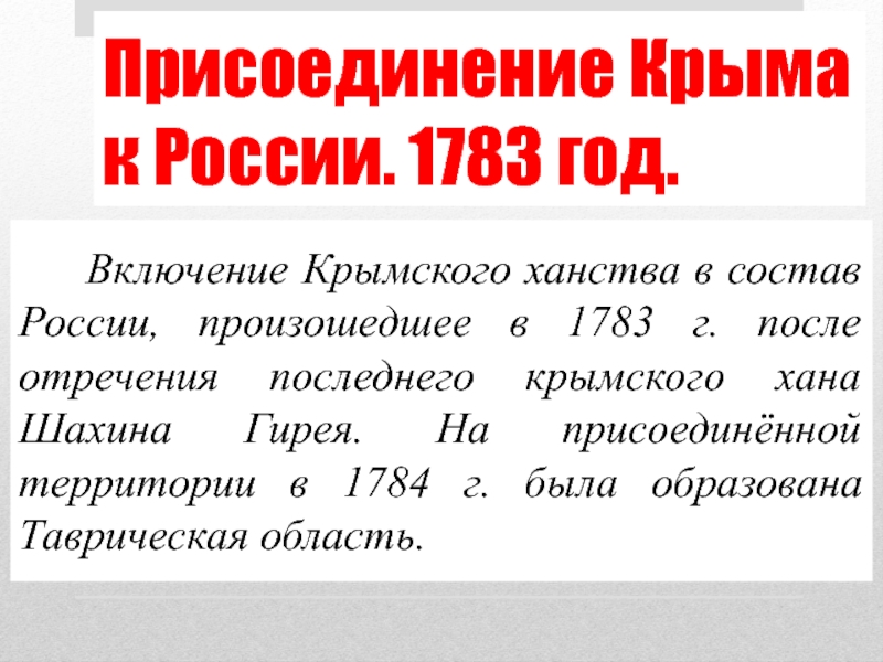 последнего крымского хана Шахина Гирея. На присоединённой территории в 1784 г. была образована Таврическая область.