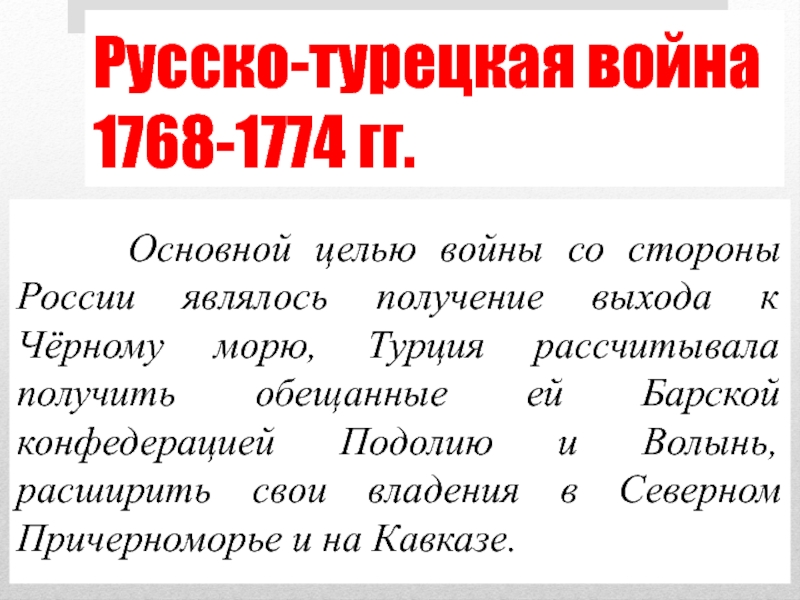 получить обещанные ей Барской конфедерацией Подолию и Волынь, расширить свои владения в Северном Причерноморье и на Кавказе.