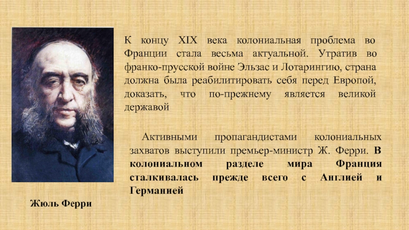 К концу XIX века колониальная проблема во Франции стала весьма актуальной. Утратив во франко-прусской войне Эльзас и Лотарингию, страна должна была реабилитировать себя перед Европой, доказать, что по-прежнему является великой державой