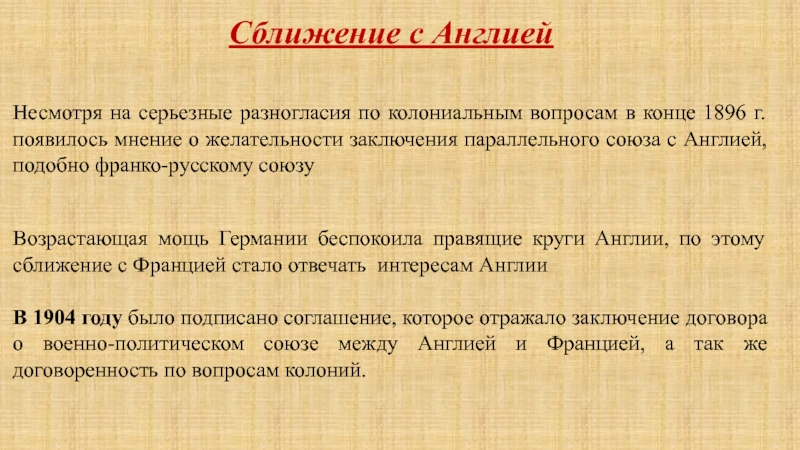 Несмотря на серьезные разногласия по колониальным вопросам в конце 1896 г. появилось мнение о желательности заключения параллельного союза с Англией, подобно франко-русскому союзу