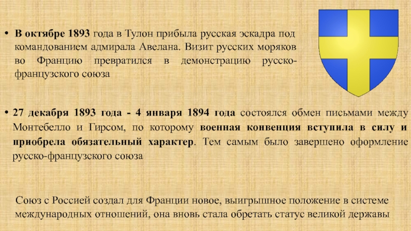 27 декабря 1893 года - 4 января 1894 года состоялся обмен письмами между Монтебелло и Гирсом, по которому военная конвенция вступила в силу и приобрела обязательный характер. Тем самым было завершено оформление русско-французского союза