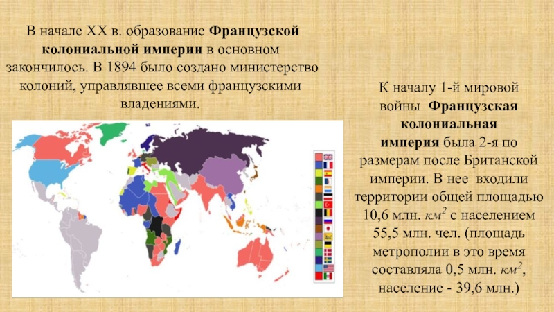К началу 1-й мировой войны Французская колониальная империя была 2-я по размерам после Британской империи. В нее входили территории общей площадью 10,6 млн. км2 с населением 55,5 млн. чел. (площадь метрополии в это время составляла 0,5 млн. км2, население - 39,6 млн.)