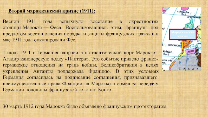 1 июля 1911 г. Германия направила в атлантический порт Марокко-Агадир канонерскую лодку «Пантера». Это событие привело франко-германские отношения на грань войны. Великобритания в целях укрепления Антанты поддержала Францию. В этих условиях Германия согласилась на подписание соглашения, признававшего преимущественные права Франции на Марокко в обмен за передачу Германии половины французской колонии Конго