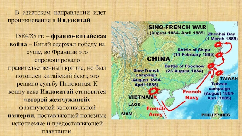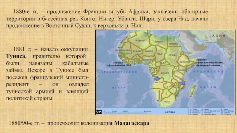 1880-е гг. – продвижение Франции вглубь Африки, захвачены обширные территории в бассейнах рек Конго, Нигер, Убанги, Шари, у озера Чад, начали продвижение в Восточный Судан, к верховьям р. Нил.