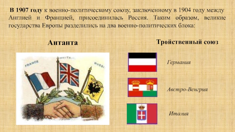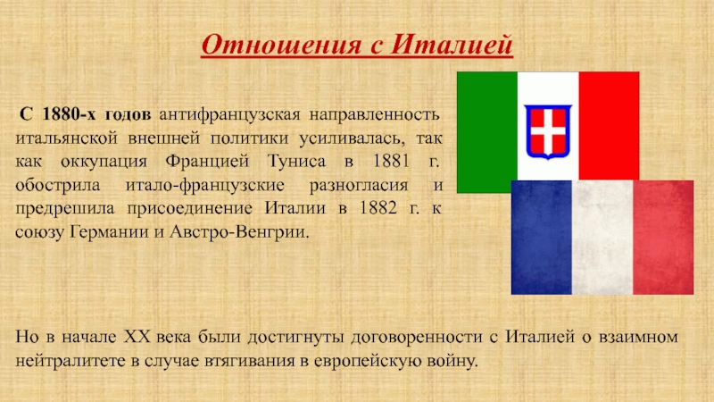 Но в начале XX века были достигнуты договоренности с Италией о взаимном нейтралитете в случае втягивания в европейскую войну.