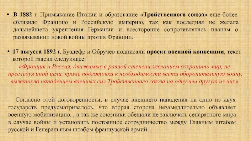«Франция и Россия, движимые в равной степени желанием сохранить мир, не преследуя иной цели, кроме подготовки к необходимости вести оборонительную войну, вызванную нападением военных сил Тройственного союза на одну или другую из них»