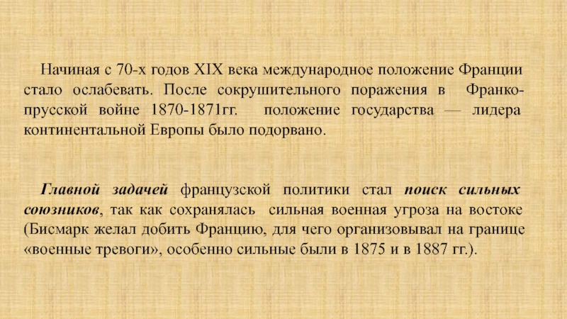В 1879 г. состоялось подписание австро-германского договора или же «Двойственного союза» – направленного, в первую очередь, против России. В этих условиях естественным геополитическим союзником Франции становилась Российская империя