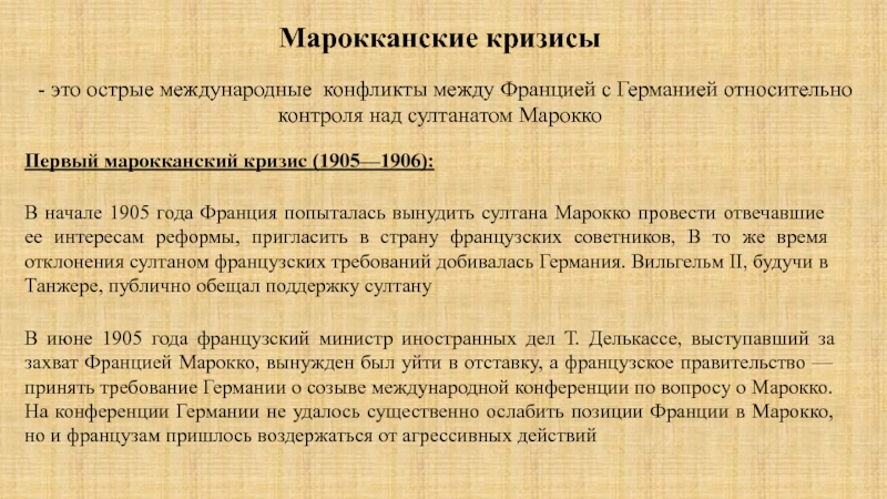 В июне 1905 года французский министр иностранных дел Т. Делькассе, выступавший за захват Францией Марокко, вынужден был уйти в отставку, а французское правительство — принять требование Германии о созыве международной конференции по вопросу о Марокко. На конференции Германии не удалось существенно ослабить позиции Франции в Марокко, но и французам пришлось воздержаться от агрессивных действий