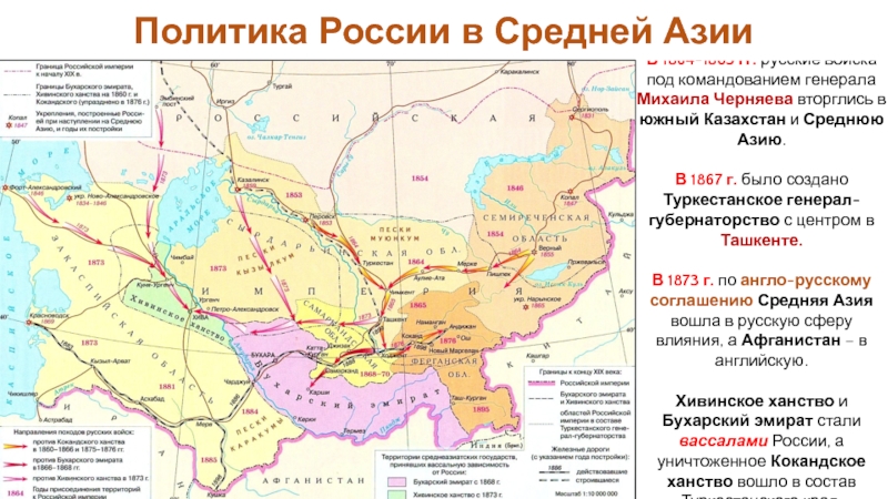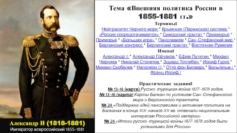 1856-1882 Александр Горчаков во главе МИДа. Отказ от догм Священного союза, активная политика в Средней Азии и на Дальнем востоке.