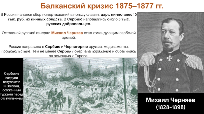 В войну с Турцией вступили Сербия и Черногория. Поведение турецких карателей вызвало возмущение по всей Европе. Общественное мнение России тем более требовало от правительства решительных действий.