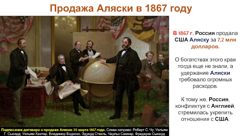 Подписание договора о продаже Аляски 30 марта 1867 года. Слева направо: Роберт С. Чу, Уильям Г. Сьюард, Уильям Хантер, Владимир Бодиско, Эдуард Стекль, Чарльз Самнер, Фредерик Сьюард