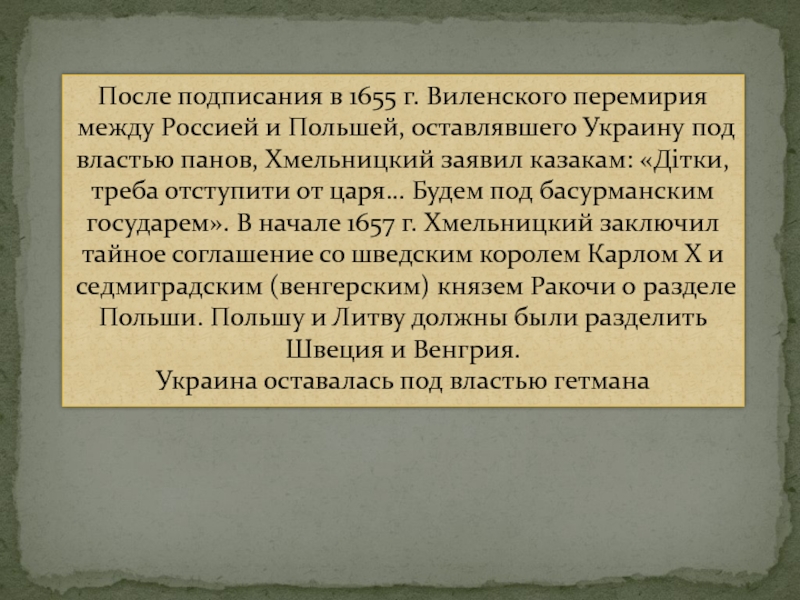 треба отступити от царя… Будем под басурманским государем». В начале 1657 г. Хмельницкий заключил тайное соглашение со шведским королем Карлом Х и седмиградским (венгерским) князем Ракочи о разделе Польши. Польшу и Литву должны были разделить Швеция и Венгрия.