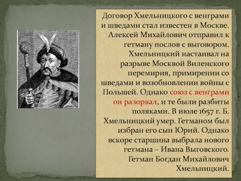 на разрыве Москвой Виленского перемирия, примирении со шведами и возобновлении войны с Польшей. Однако союз с венграми он разорвал, и те были разбиты поляками. В июле 1657 г. Б. Хмельницкий умер. Гетманом был избран его сын Юрий. Однако вскоре старшина выбрала нового гетмана – Ивана Выговского. Гетман Богдан Михайлович Хмельницкий.