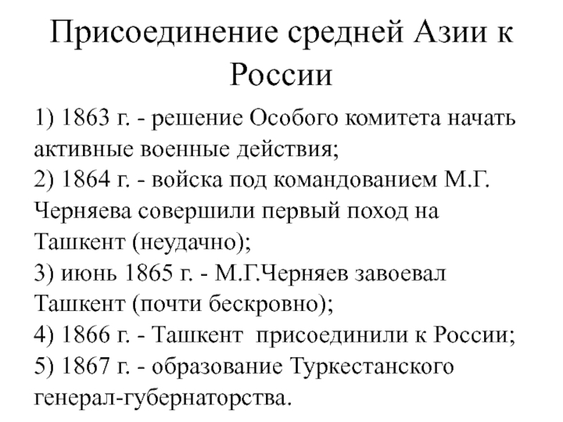 3) июнь 1865 г. - М.Г.Черняев завоевал Ташкент (почти бескровно);