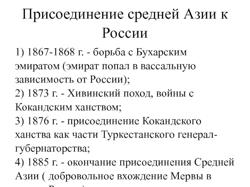 4) 1885 г. - окончание присоединения Средней Азии ( добровольное вхождение Мервы в состав России)