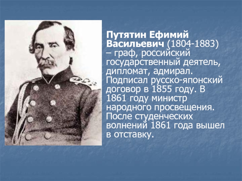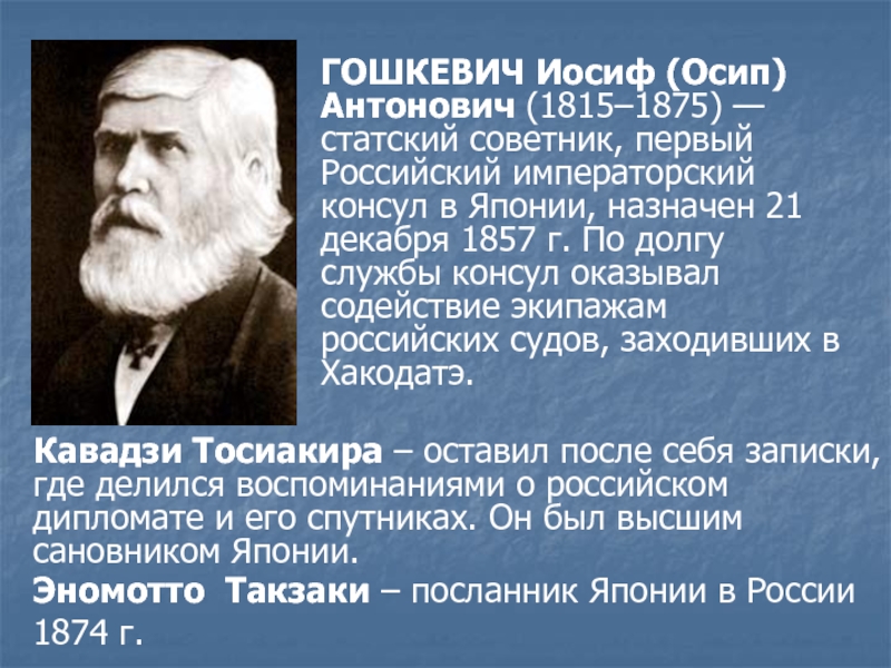 Кавадзи Тосиакира – оставил после себя записки, где делился воспоминаниями о российском дипломате и его спутниках. Он был высшим сановником Японии.
