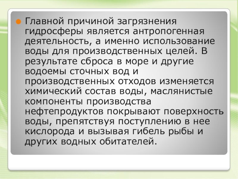 Слайд 18Главной причиной загрязнения гидросферы является антропогенная деятельность, а именно использование