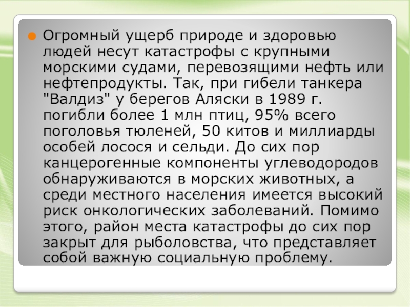 Слайд 19Огромный ущерб природе и здоровью людей несут катастрофы с крупными